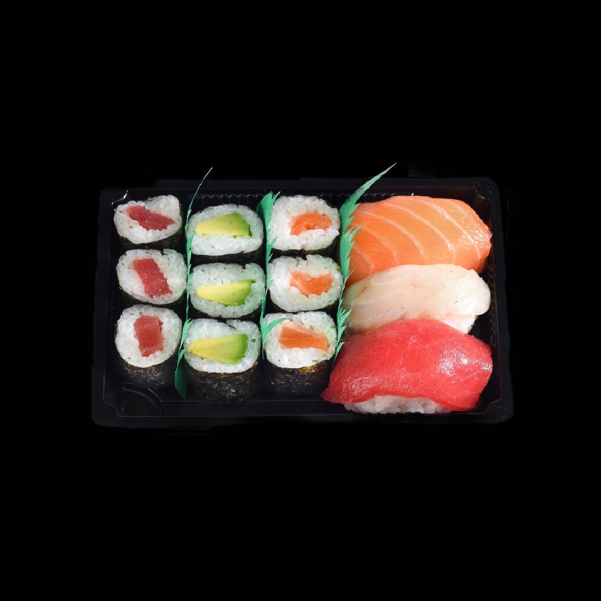 9 Maki de salmón, atún y aguacate + 3 Nigiri de salmón, atún y langostino